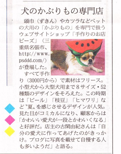 | 日経流通新聞のトレンドボックスに、犬のかぶりもの専門店として紹介されました。(7月23日付) | |||